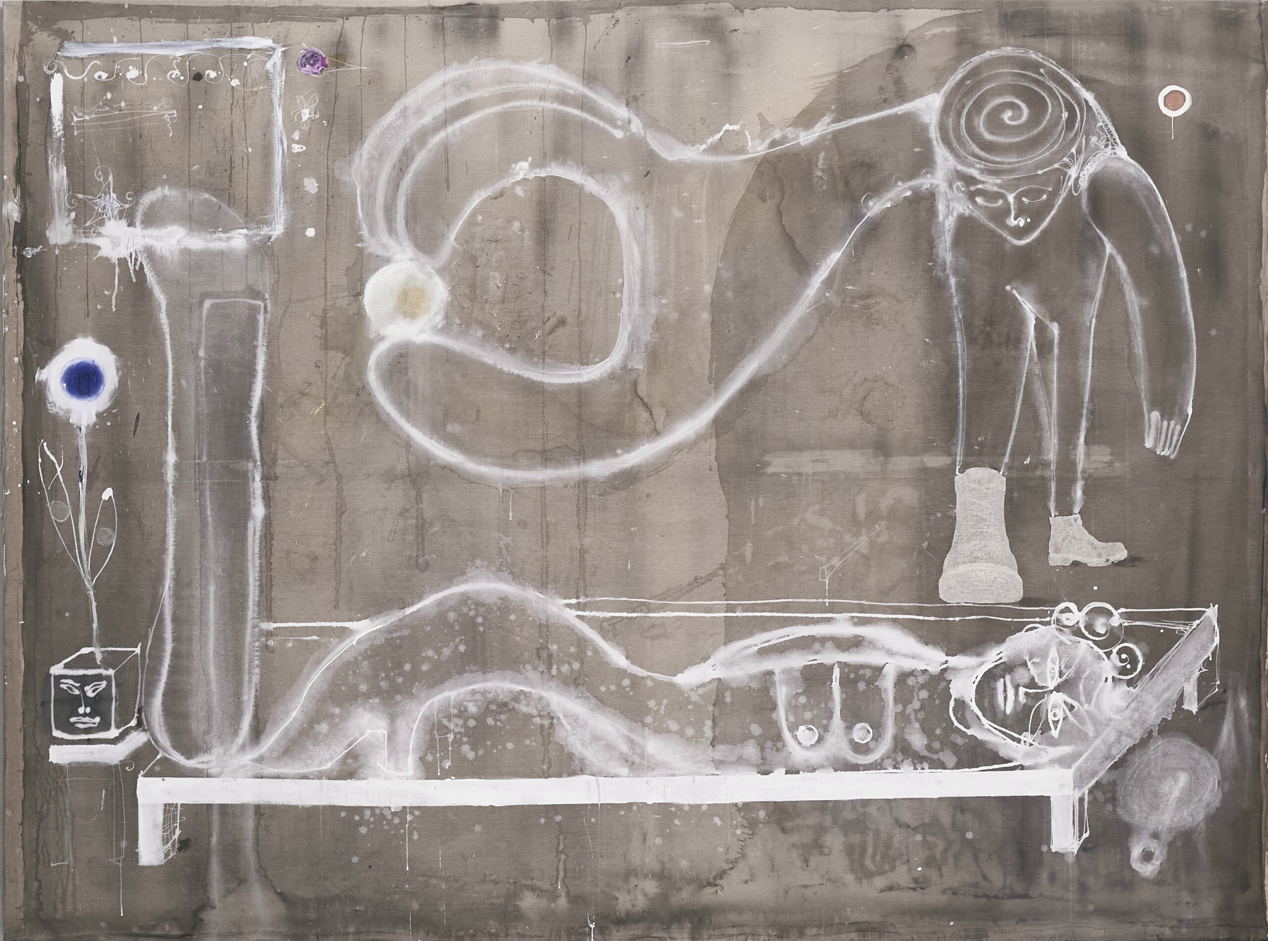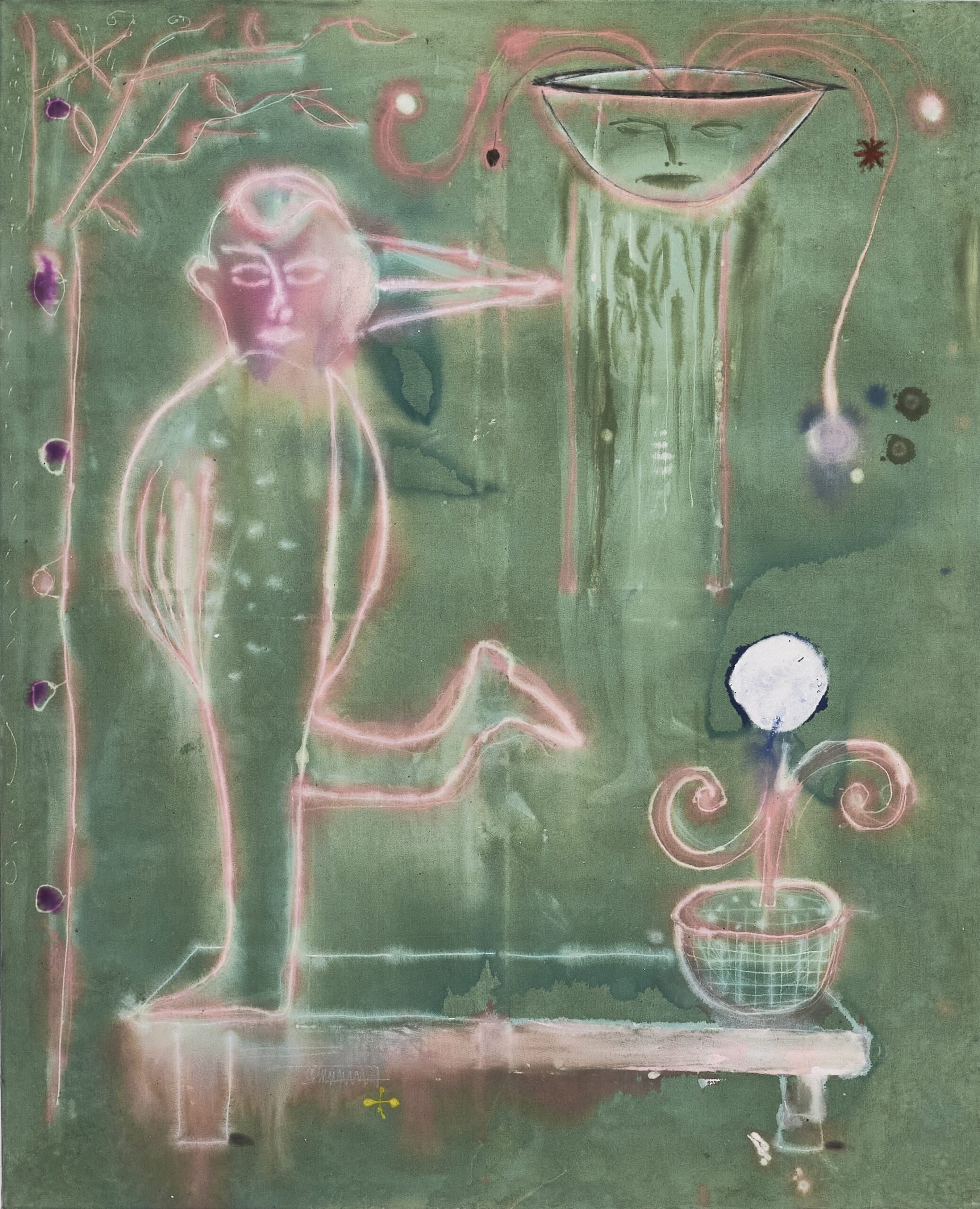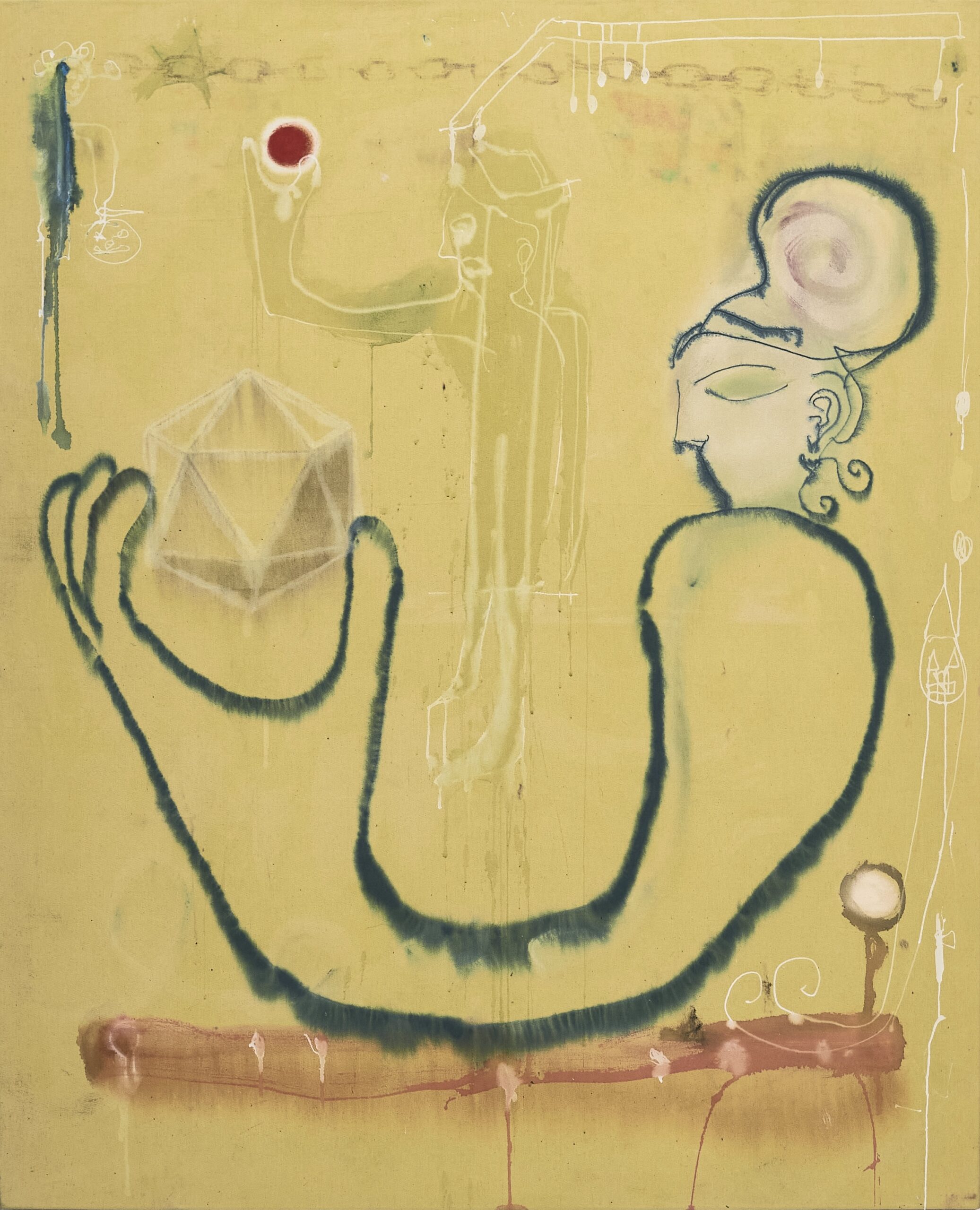 His canvases are kinetic force fields. Through an alchemical interplay of glazes, spray mists, and graphic overlays, he allows geometric bodies to drift through diffuse chromatic spaces. This architecture of layering cites the experimental spirit of Sigmar Polke, yet translates it into a technoid, fleeting aesthetic of the present. Between cool greys and eruptive nuances of blue, he creates paintings that seem to breathe physically.